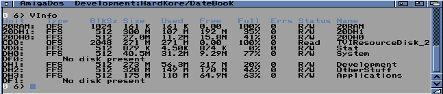 The difference between C:Info and VInfo is the lack of the `Volumes available:' list and information is displayed as bytes rather than blocks. It's also a bit larger than either C:Info or QInfo, I was more concerned with functionality than code size.
